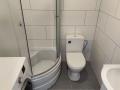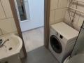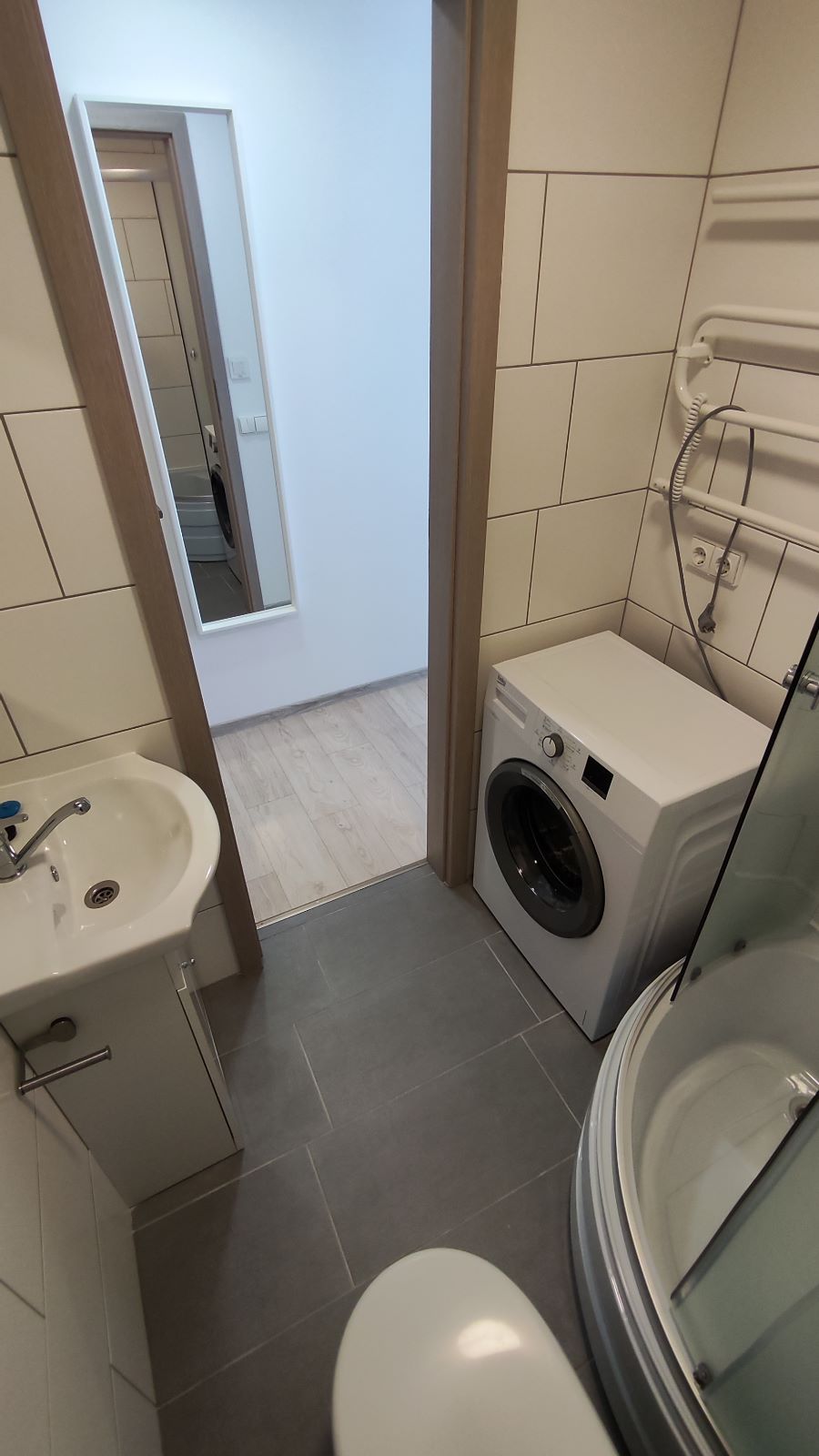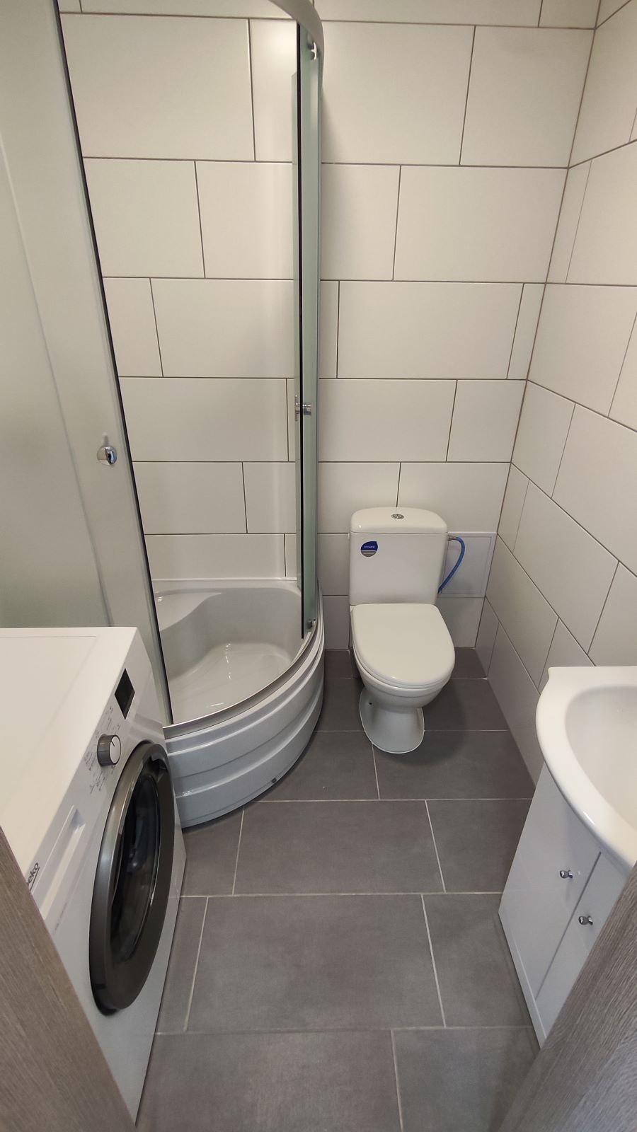 Paruoštas tualetas su dušu, kriauklė su veidrodžiu, orlaidė ir saugykla. Apdailintos sienos lengvam valymui. Skalbimo mašina ir rankšluosčių šildytuvas.