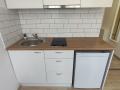 Pilnai įrengta virtuvė su orkaitės ištraukimu, šaldytuvu, kriaukle ir orkaite. Dengta siena geresniam valymui. Daug spintelių ir stalčių.